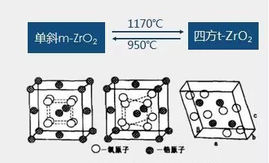 ZrO2四方相與單斜相之間的轉變是馬氏體相變,由于四方相轉變為單斜相時有 3~5%的體積膨脹和 7~8%的切應變。因此,純 ZrO2 制品往往在生產過程(從高溫到室溫的冷卻過程)中會發生 t-ZrO2 轉變為 m-ZrO2 的相變并伴隨著體積變化而產生裂紋,甚至碎裂,因此無多大的工程價值。