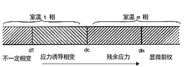 誘發(fā)顯維裂紋的臨界直徑dm。當d>dc的晶粒室溫下為m相,由于相變的體積效應(yīng),產(chǎn)生顯微裂紋或應(yīng)力。d>dm的晶粒相變時,相變產(chǎn)生的積累變形大,誘發(fā)顯微裂紋。dc>d>dm的晶粒相變時,相變產(chǎn)生的積累變形小,不足誘發(fā)顯維裂紋,當其周圍存在殘余應(yīng)力。