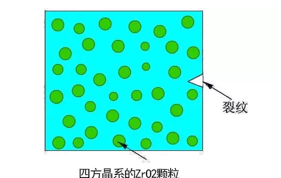 氧化鋯中四方相向單斜相的轉(zhuǎn)變可通過應(yīng)力誘發(fā)產(chǎn)生。當材料受到外界拉應(yīng)力時,基體對ZrO2的壓抑作用得到松弛,ZrO2顆粒即發(fā)生四方相到單斜相的轉(zhuǎn)變,這種相變將吸收能量而使裂紋尖端的應(yīng)力場松弛,增加裂紋擴展阻力,從而大幅度提高陶瓷材料的韌性。