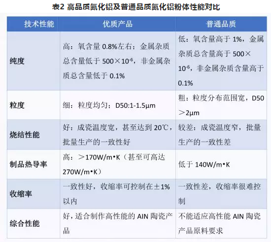 這其中日本德山曹達公司采用的氧化鋁粉碳熱還原法生產的AIN粉被全球公認為質量最好,性能最穩定,基本占據了AIN粉市場。日本東芝,京瓷公司,住友電子等大部分基板和封裝都在使用該AIN粉。此外,美國DOW化學公司也掌握了氧化鋁粉碳熱還原法生產AIN粉技術。日本東洋鋁公司則采用成本相對較低的鋁粉直接氮化法生產AIN粉,性能也挺好,熱導率也能穩定在170W/m•K以上。優質的AIN粉及品質一般的氮化鋁粉的區別見下表分析。