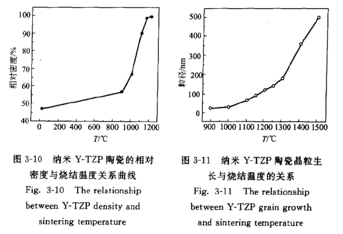 較圖3-10和圖3-11可知,在1150℃時(shí)可獲得燒結(jié)相對密度達(dá)97.5%,晶粒大小僅90nm左右的納米YTZP材料。