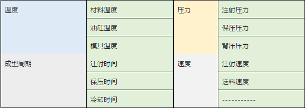 注射成型過程工藝參數涉及溫度、成型周期、壓力、速度四個方面,具體參數如表所示。