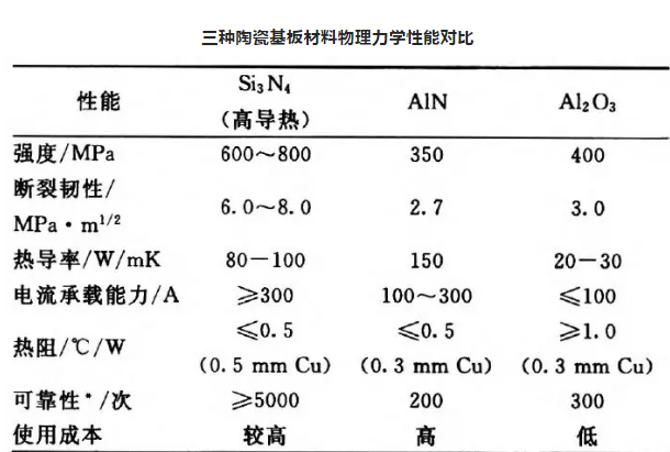 此外,氮化硅的線膨脹系數(shù)與Si、SiC和GaAs等半導(dǎo)體材料匹配良好,這使氮化硅陶瓷成為一種極具有吸引力的高強高導(dǎo)熱電子器件基板材料。氮化硅、氮化鋁及氧化鋁陶瓷的力學(xué)性能對比見下表。