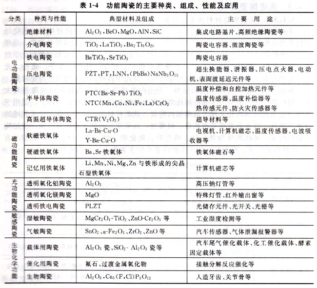 功能陶瓷是指以非力學性能(如電、磁、熱、化學、生物等性能)為主的陶瓷磚B=有些陶瓷材料既是結構材料也是功能材料,如2r02、A12 03、SiC等。功能陶瓷制品具有品種多、應用廣、更換頻繁、體積小、附加值高等特點,主要有金屬氧化物和Ba、Pb、Mg及Sr的鈦酸鹽等,表1-4簡要介紹幾種主要功能陶瓷。